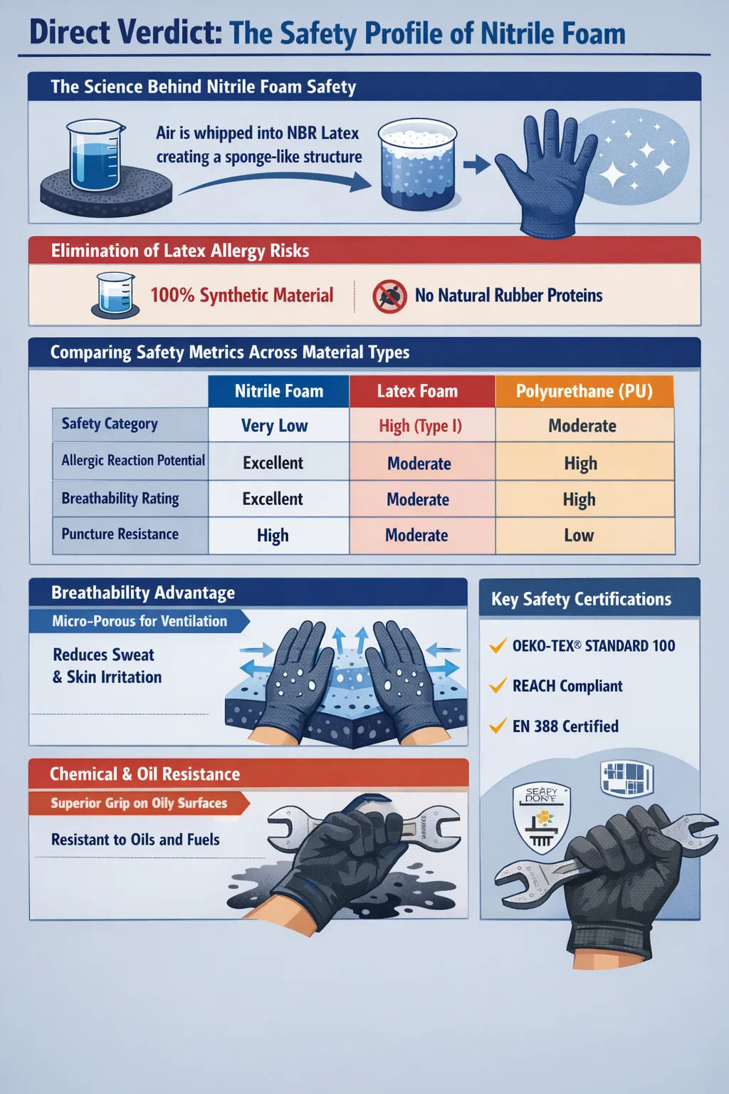 Inzicht in de veiligheid van nitril schuim vereist een vergelijking met andere gangbare coatingmaterialen zoals polyurethaan (PU) of latex. De onderstaande tabel laat zien hoe nitril zich onderscheidt op het gebied van de gezondheid en bescherming van de gebruiker.