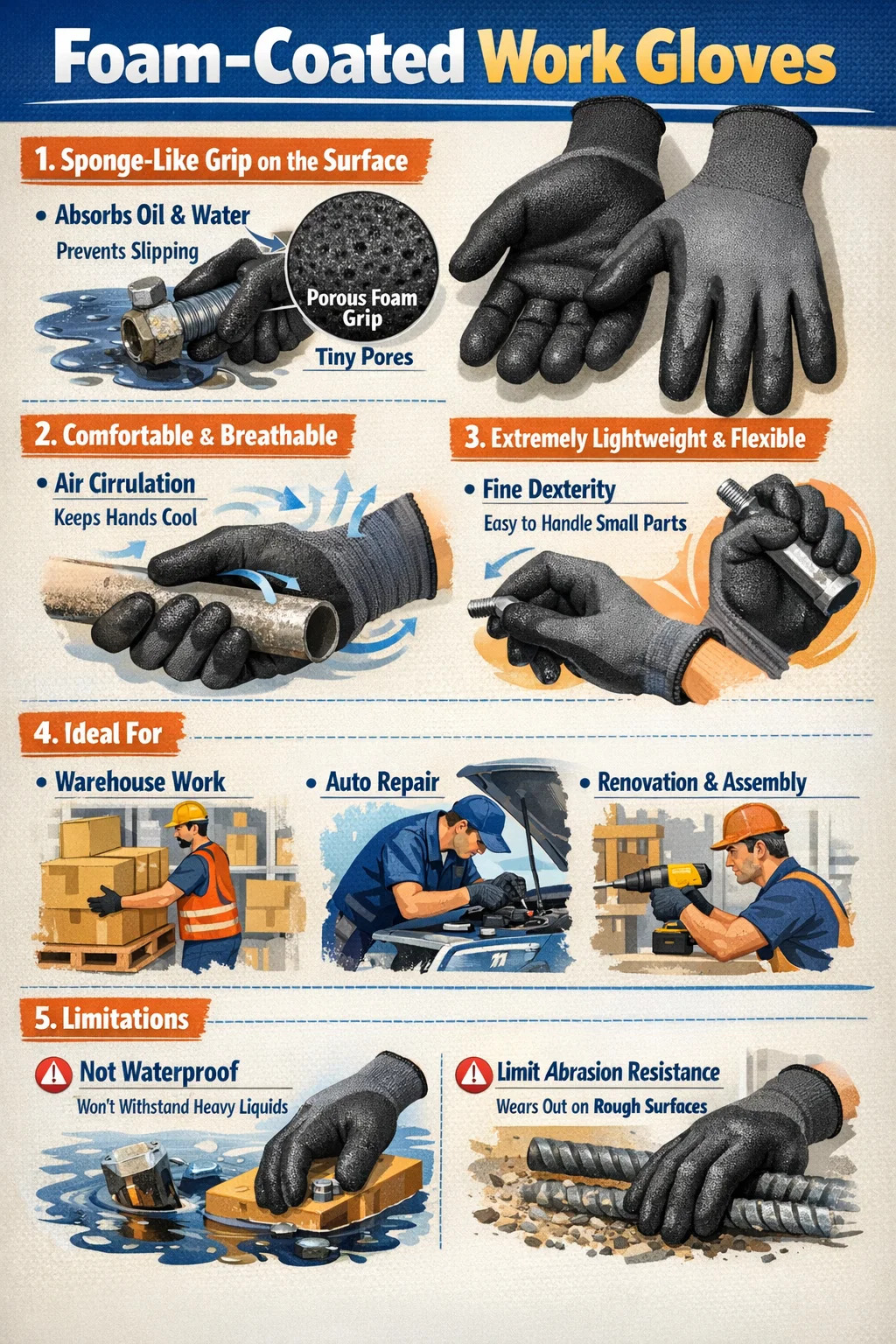 Schuimhandschoenen dit betekent niet dat de hele handschoen van schuim is gemaakt; ze verwijzen eerder naar gewone stoffen handschoenen bedekt met een speciaal behandelde laag rubber of polymeer met kleine poriën.
