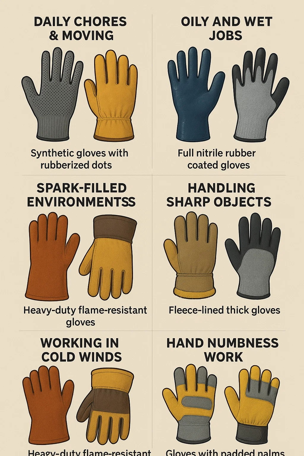 Er is geen one-size-fits-all antwoord bij het kiezen van echt goed werkhandschoenen —het beste paar hangt volledig af van het werk dat je doet. De sleutel is om de meest geschikte bescherming en functie te vinden. Dit zijn de voorkeurstypen voor veelvoorkomende scenario's: