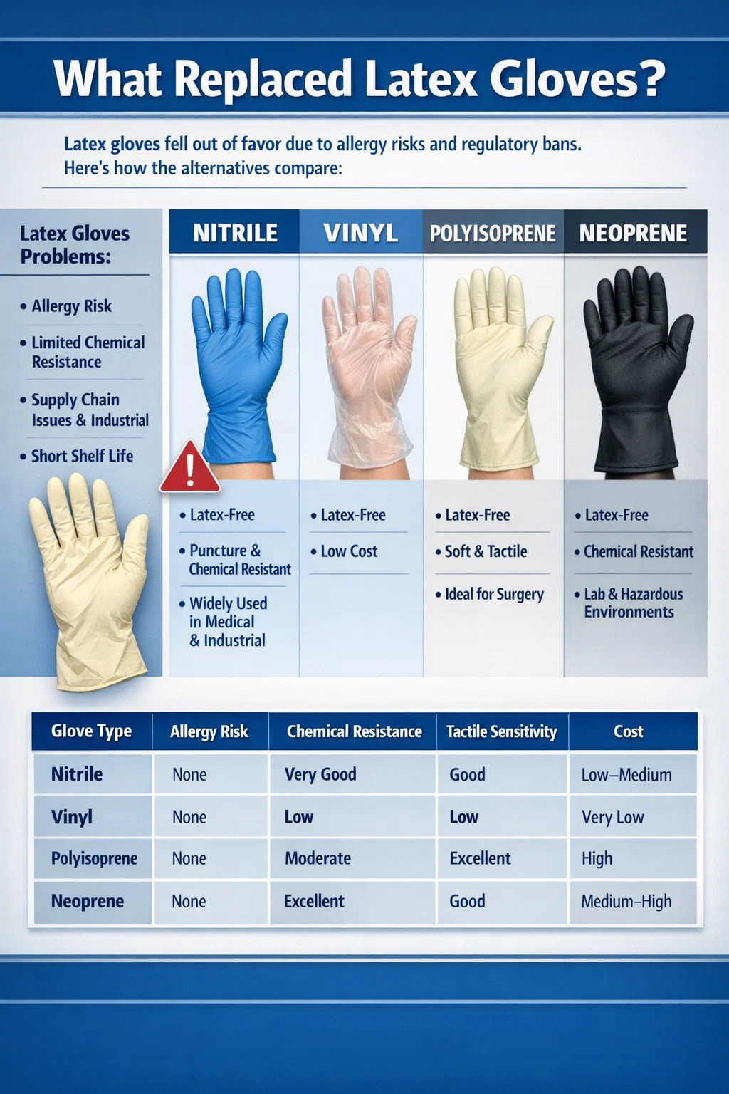In gereguleerde gezondheidszorgomgevingen in ontwikkelde markten zijn latexhandschoenen echter feitelijk verouderd. De vraag wat de latexhandschoenen heeft vervangen, heeft in die contexten een duidelijk antwoord: nitril deed dat, terwijl polyisopreen de precisie-chirurgische niche bedekte. In bredere consumenten- en industriële markten is het antwoord gevarieerder, maar de reisrichting is onmiskenbaar weg van latex en in de richting van synthetische alternatieven die het risico op allergie elimineren zonder noemenswaardige compromissen op het gebied van prestaties.