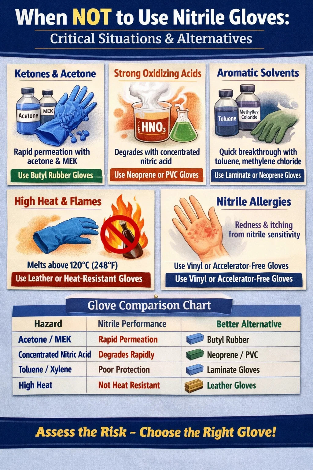Het korte antwoord: vermijd nitrilhandschoenen bij het hanteren van bepaalde ketonen, sterk oxiderende zuren of sterk geconcentreerde oplosmiddelen; bij het werken met extreme hitte of open vuur; wanneer fijne tactiele behendigheid van cruciaal belang is en de taakduur kort is; of wanneer de persoon die ze draagt een gedocumenteerde nitrilgevoeligheid heeft. Lees verder voor het volledige overzicht.