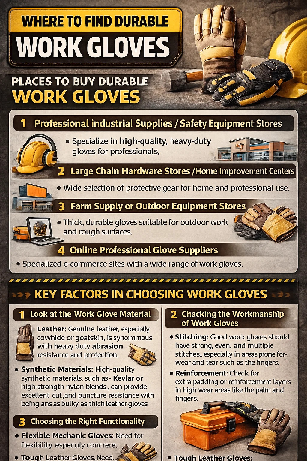 Deze winkels zijn niet zo gebruikelijk als gewone winkels, maar ze zijn gespecialiseerd in het leveren aan professionals in de bouw, productie en andere industrieën die stevige handschoenen nodig hebben.